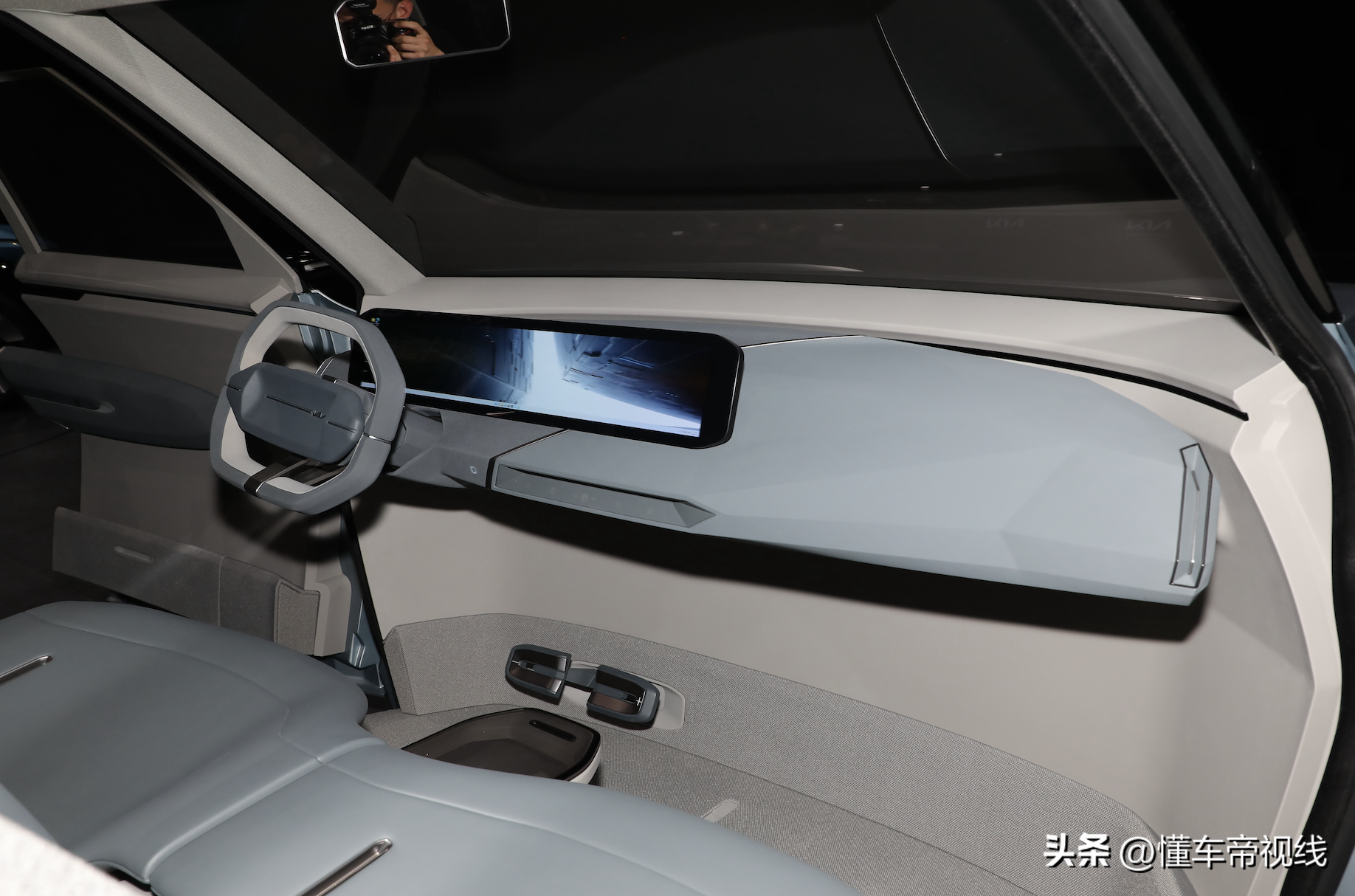 EV5概念车的内饰设计风格较为简约,中控台部分设有一体式屏幕和隐藏式出风口,而常见的挡杆、雨刷器拨杆、物理按键等全部被“隐藏”。另外,双平底造型方向盘和前排贯通式设计也是该车内饰亮点。起亚表示,EV5概念车内饰中采用了多种环保材料,例如座椅、车门、仪表盘和顶棚上应用了海藻提取物、回收塑料等材料。