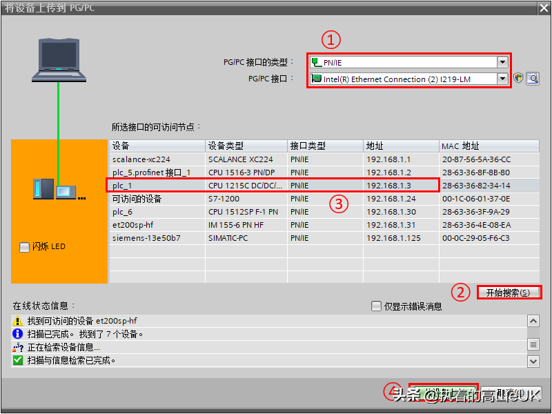 ①PGPC接口的类型选择PN/IE,接口选择电脑网卡