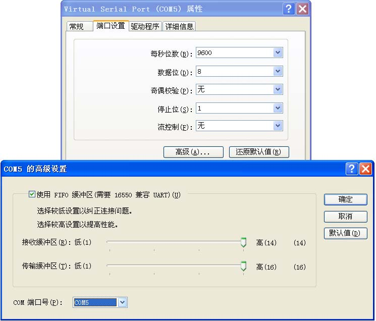12、将通讯端口编号设为COM5,即是步骤5安装完成的VirtualSerialPort(COM5);