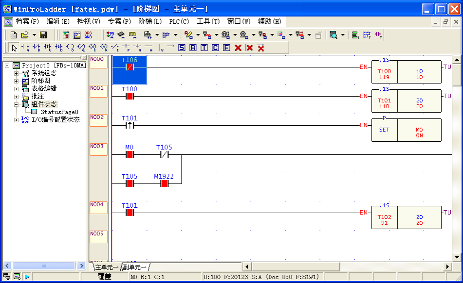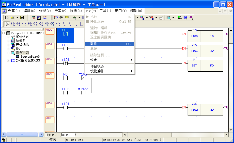 10、打开FatekPLC软件:WinProladder;选择“PLC”菜单下的“联机”;