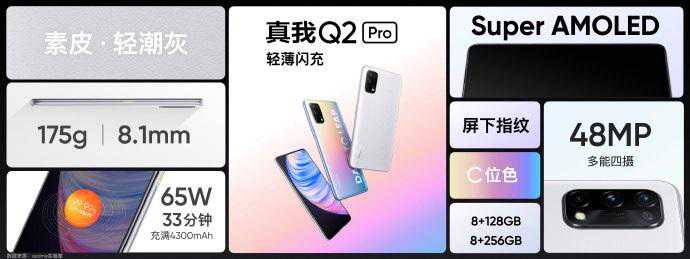 真我Q2Pro整机重量轻至175克,搭载了6.43英寸的三星SuperAMOLED屏,最高亮度达600nit,支持180Hz采样率,同时采用新一代光感指纹模组,支持屏下指纹识别。内置4300mAh电池,支持65W智慧闪充,33分钟可充满电,充电3分钟,即可开黑1小时或者待机2天。真我Q2Pro后置4800万全能四摄,前置1600万像素摄像头。