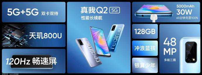 真我Q2搭载6.5英寸120hHz高刷屏,采用新一代AG磨砂工艺,提供银翼少年和冲浪蓝孩两种配色,重量为194克,内置5000mAh电池,支持,30W智慧闪充,可1小时充满,4800万后置三摄+1600万夜色自拍。