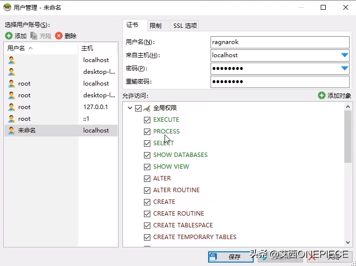 目前我们看到的库都是Mysql安装时自带默认的库,现在我们要创建一个账户用于我们RO模拟器的。我们创建一个用户:ragnarok