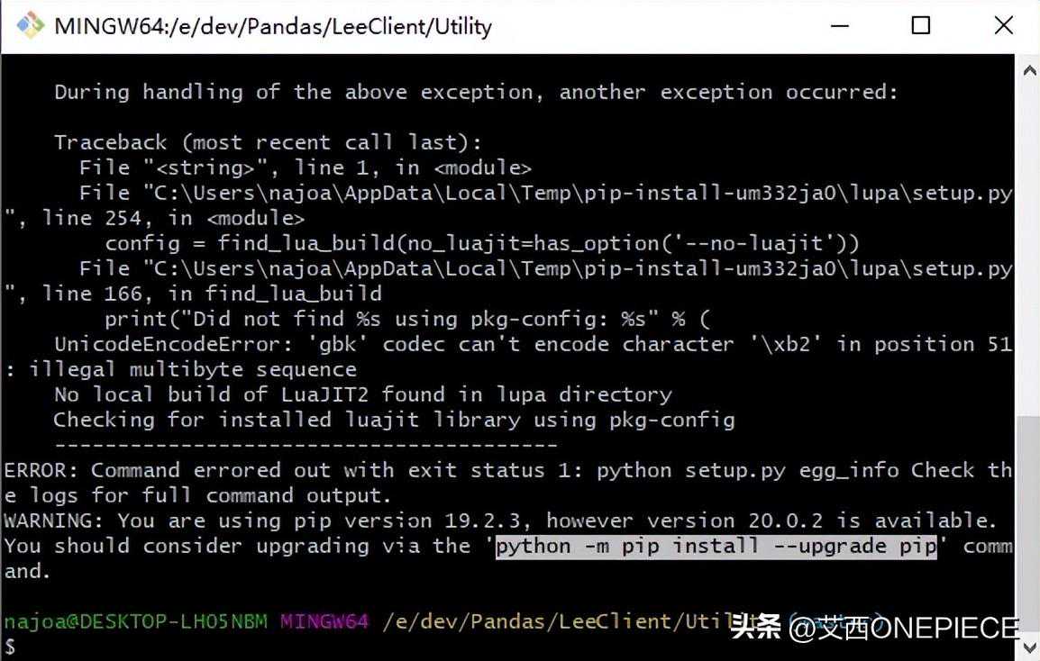 图中出现升级pip的一个指令,原因:提示当前版本为19.2.3得20.0.0版本才行,那么可以根据提示执行一下:$python一mpipinstall--upgradepip然后再次执行指令回车发现最后还是报错,我们查看原因lupa缺失,的再安装一个lupa