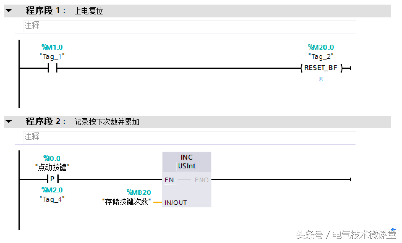 (2)加计数CTU只有复位端口状态为1时复位,使用复位指令RESET无法对CV的输出值复位,可以在R端口设定逻辑条件执行复位。而递增指令需用复位指令对存储累加值的存储器进行区域复位,累加值发生溢出时会自动复位。