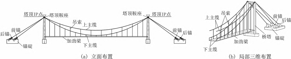 不同垂度四主缆悬索桥结构体系主要包括横向分两侧布置的4根主缆、锚固主缆的锚碇、加劲梁、吊索等。