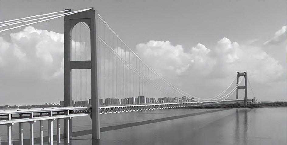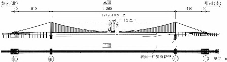 为满足长江通航要求、规避南塔附近襄樊-广济断裂带的不利影响,对大桥轴线进行局部调整,采用主跨1860m悬索桥方案,一孔跨越通航水域及断裂带。