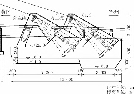 由于桥面支承构造以下塔柱高度较小,仅34.0m(黄冈侧)、22.3m(鄂州侧),若设下横梁,温度引起的约束内力较大,故不设下横梁,改设上、下2层牛腿以支承桥梁结构。