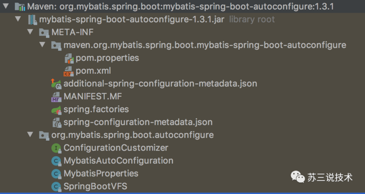 从上面可以看出,文件中会引入一些jar包,其中除了引入spring-boot-starter,之外重点看一下:mybatis-spring-boot-autoconfigure。