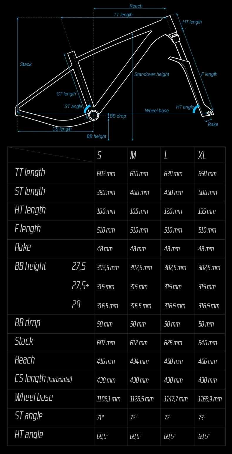 ROCKRIDERXC系列车架的几何设定非常偏向下坡,设定较为激进。部分数据接近29林道甚至uro。和Chisel一样,ROCKRIDERXC拥有更长的reach(前伸量)、更短的头管以及更舒缓的头管角度,部分数据ROCKRIDERXC更为“夸张”。就几何方面来讲ROCKRIDERXC是一款可以直接下赛道的车。