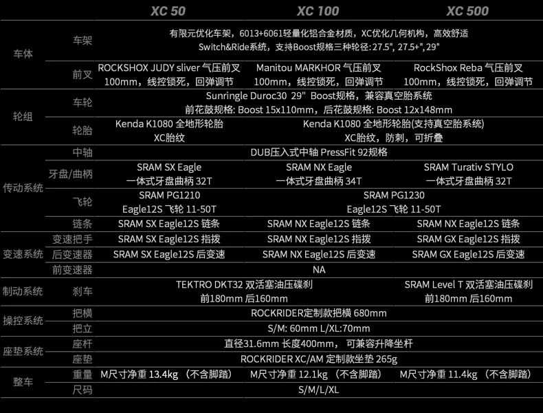 其铝合金系列拥有XC50、XC100、XC500三款车型。三者均采用同款铝合金车架,60616013三抽管铝合金车架,轻量坚固,支持27.5、275+以及29轮径。