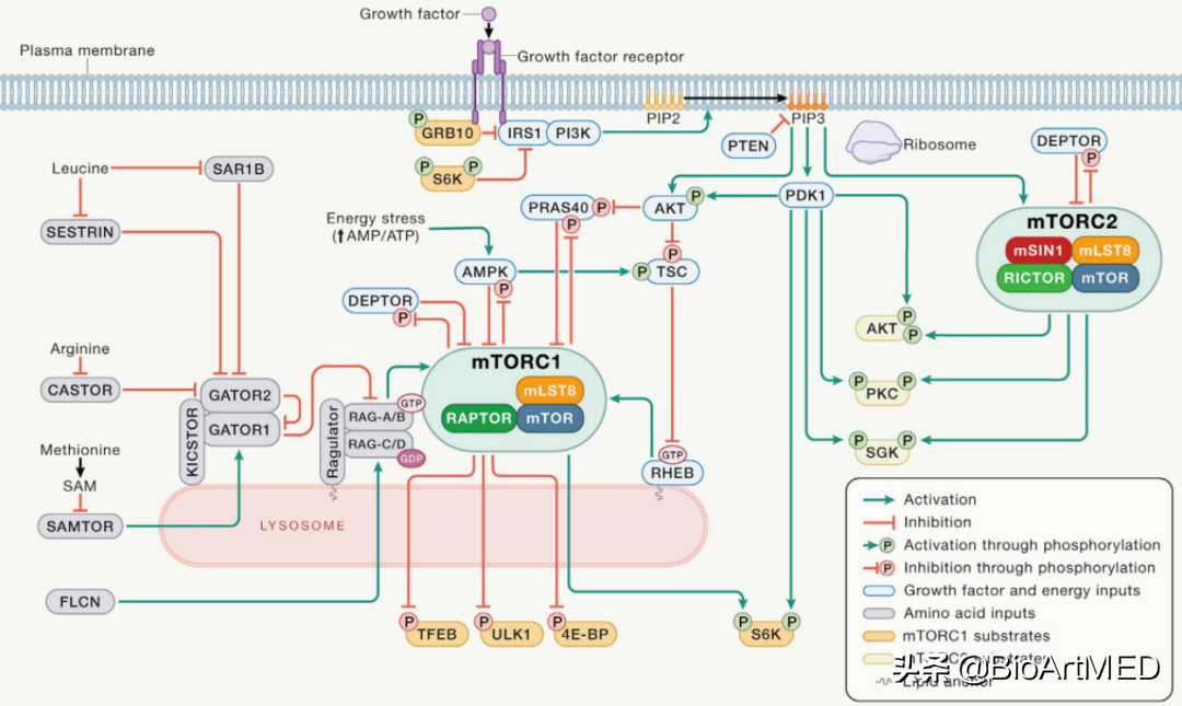生长因子通过PI3K-AKT-TSC活化mTORC1。酪氨酸激酶受体受到细胞表面胰岛素或其他生长因子的刺激后,活化PI3K。PI3K将PIP2转化为PIP3。PDK1在细胞质膜中与PIP3结合,并通过磷酸化AKT-Thr308激活AKT。活化的AKT磷酸化并抑制TSC复合物(包括TSC1、TSC2和TBC1D7)。TSC复合物是小GTPaseRHEB的GAP。GTP-boundRHEB通过结合mTOR中的两个HEATrepeats和FAT结构域来变构激活mTORC1。因此,PI3K-AKT依赖性TSC复合物抑制通过将RHEB锁定在其活化的GTP-bound状态来激活mTORC1。