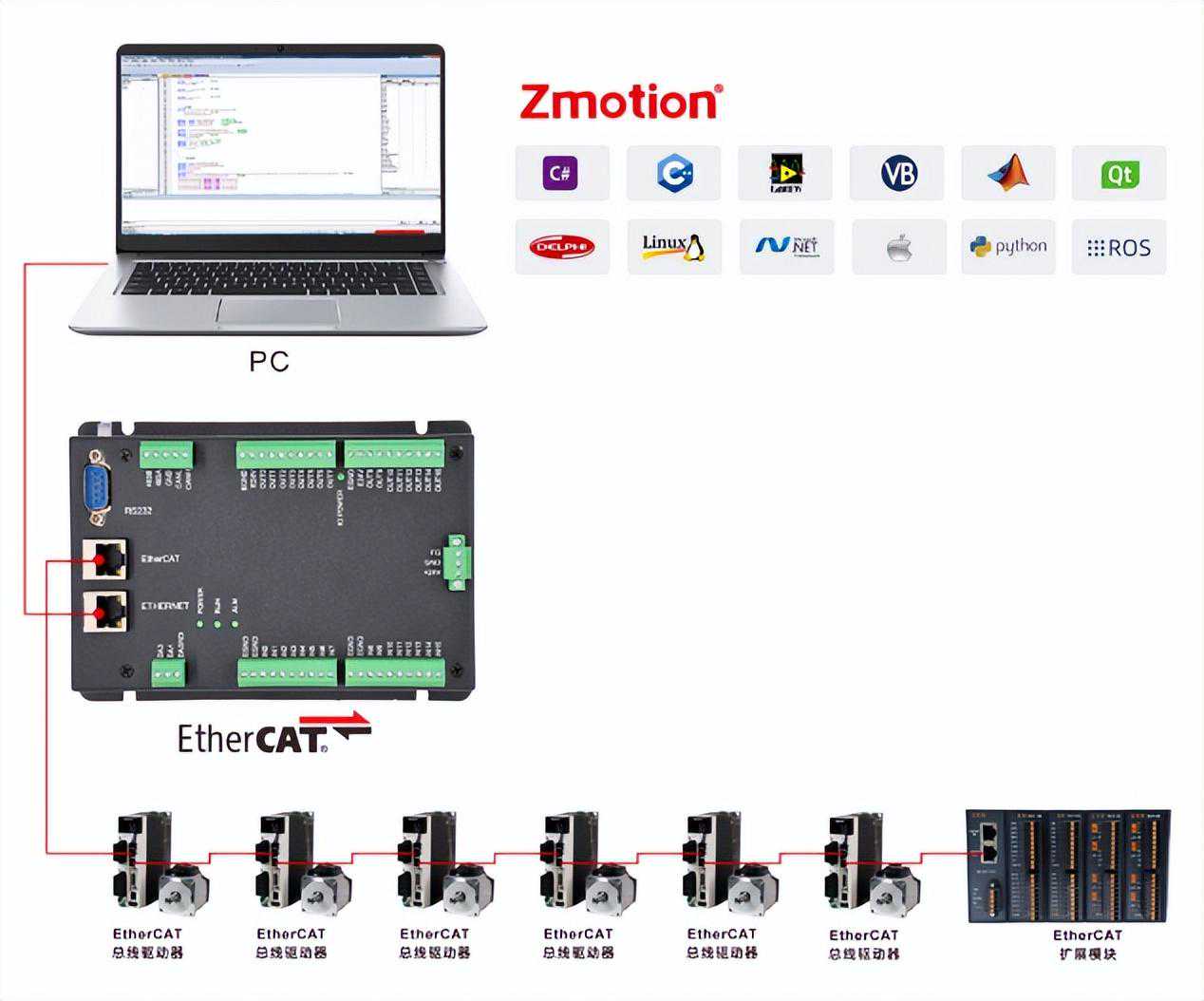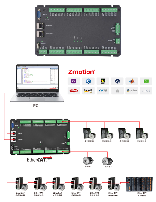 (2)运动控制包含:单轴运动控制、多轴插补运动、机械手正反解算法等;EtherCAT通讯包含PDO通讯与SDO通讯。