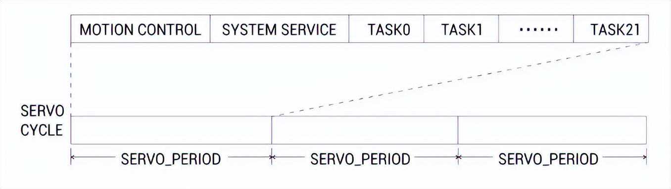 1.运动控制器每个运动控制周期(SERVOPERIOD)包含MC、SS、以及用户多任务程序的运行,如下图所示。
