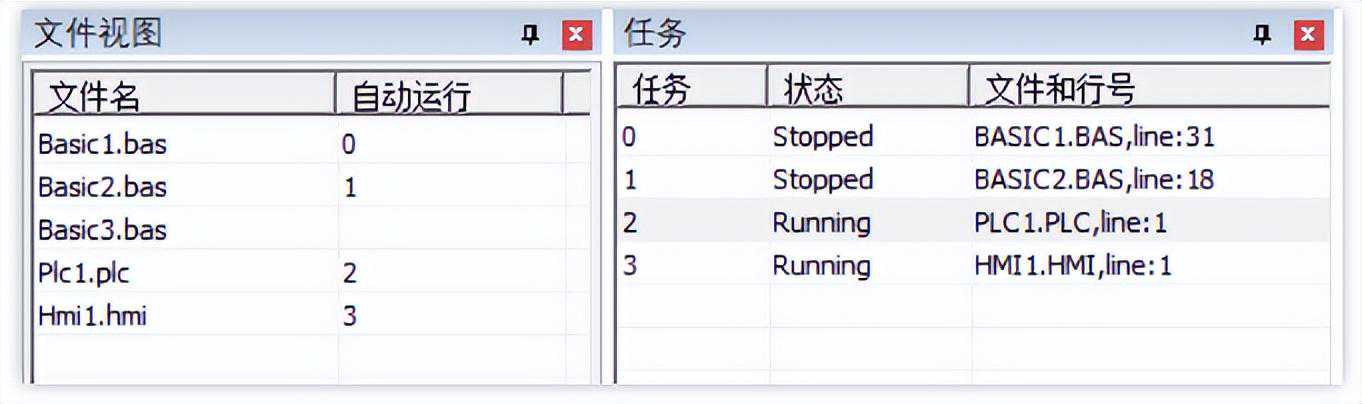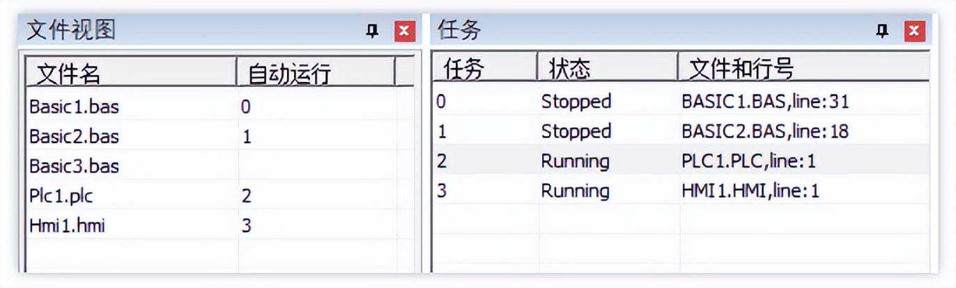 (1)自动运行任务号:在“文件视图”窗口设置自动运动任务号。控制器上电后首先执行带自动运行任务号的文件,自动运行任务号Basic文件可设置多个,PLC文件和HMI文件仅支持一个。自动运行文件为并行运行,上电后同时开启。