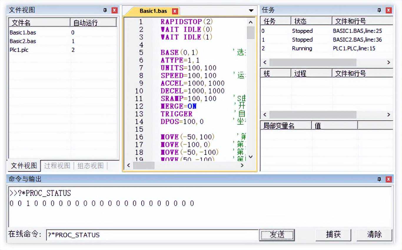示例:如下图所示,Basic文件用于参数初始化,PLC文件用于条件控制轴运行。Basic文件由自动运行任务号0开启,PLC文件由Basic文件内的RUN指令开启,开启之后循环扫描。