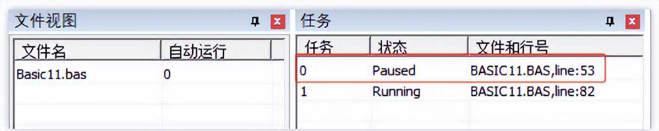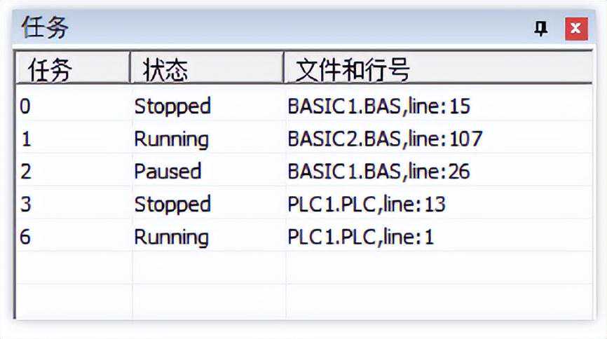 在菜单栏“调试”→“启动/停止调试”打开任务窗口(如下图所示),任务窗口可以查看已经开启的任务的任务编号、运行状态、当前文件和运行行号,看不到未开启的任务。