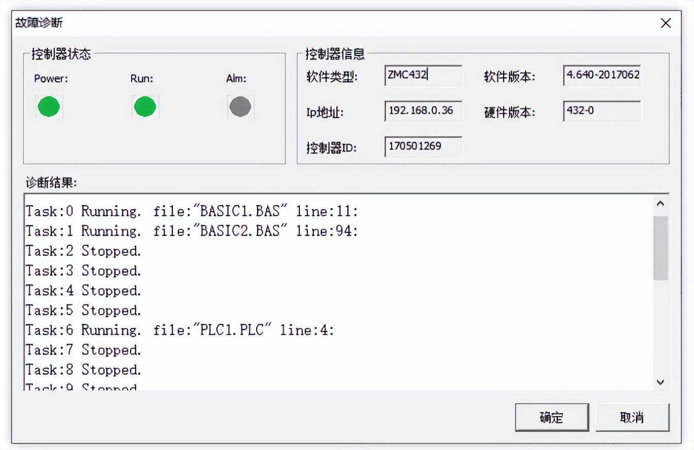 可查看控制器的支持的所有任务编号的状态、所处的文件和运行的行号。窗口也可以显示各任务报错的故障信息,如下图所示。