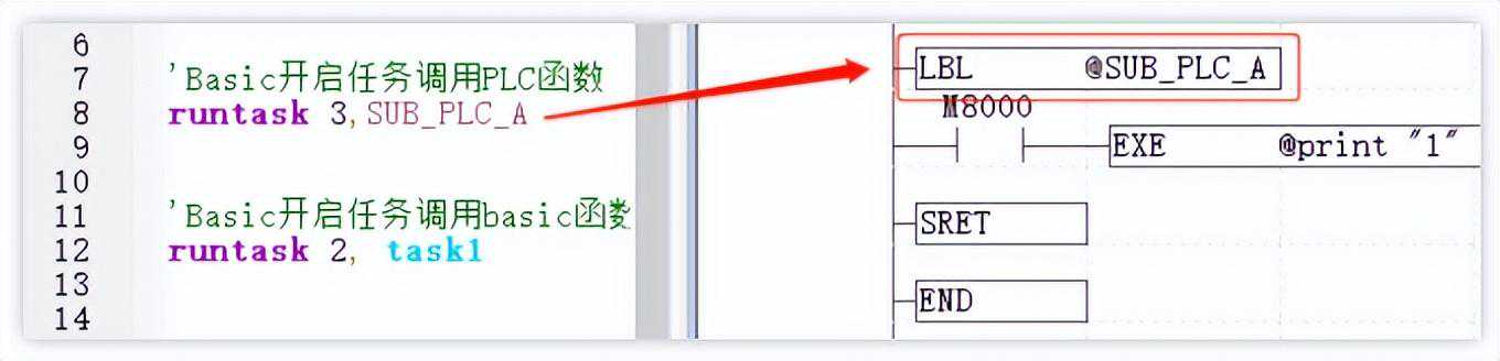(2)Basic文件内使用RUNTASK指令调用PLC内LBL指令定义的子程序,如下图。