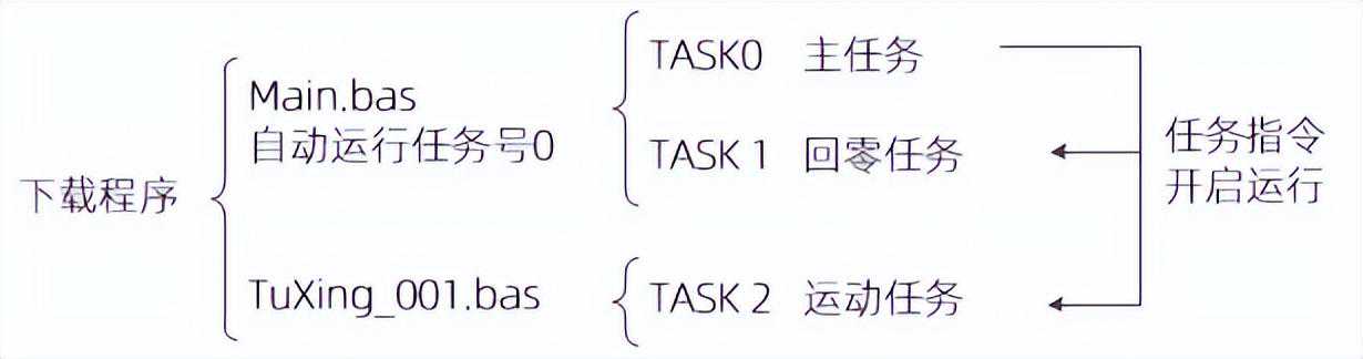 程序下载运行,首先启动带自动运行任务号的文件,自动运行任务号可设置多个,也可以只设置一个,其他的文件任务采用RUN指令开启。