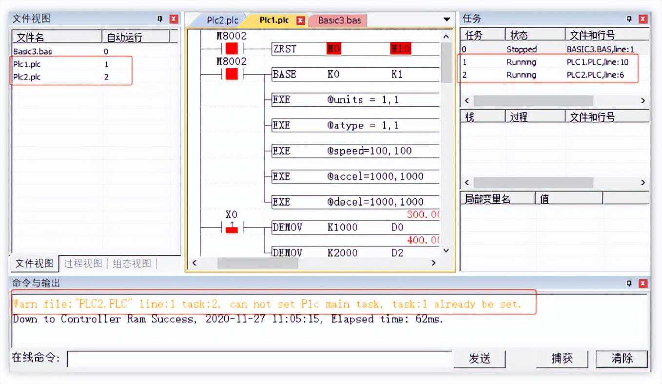 如下图4-7,Basic任务0和1已运行完停止,PLC任务2正在运行。