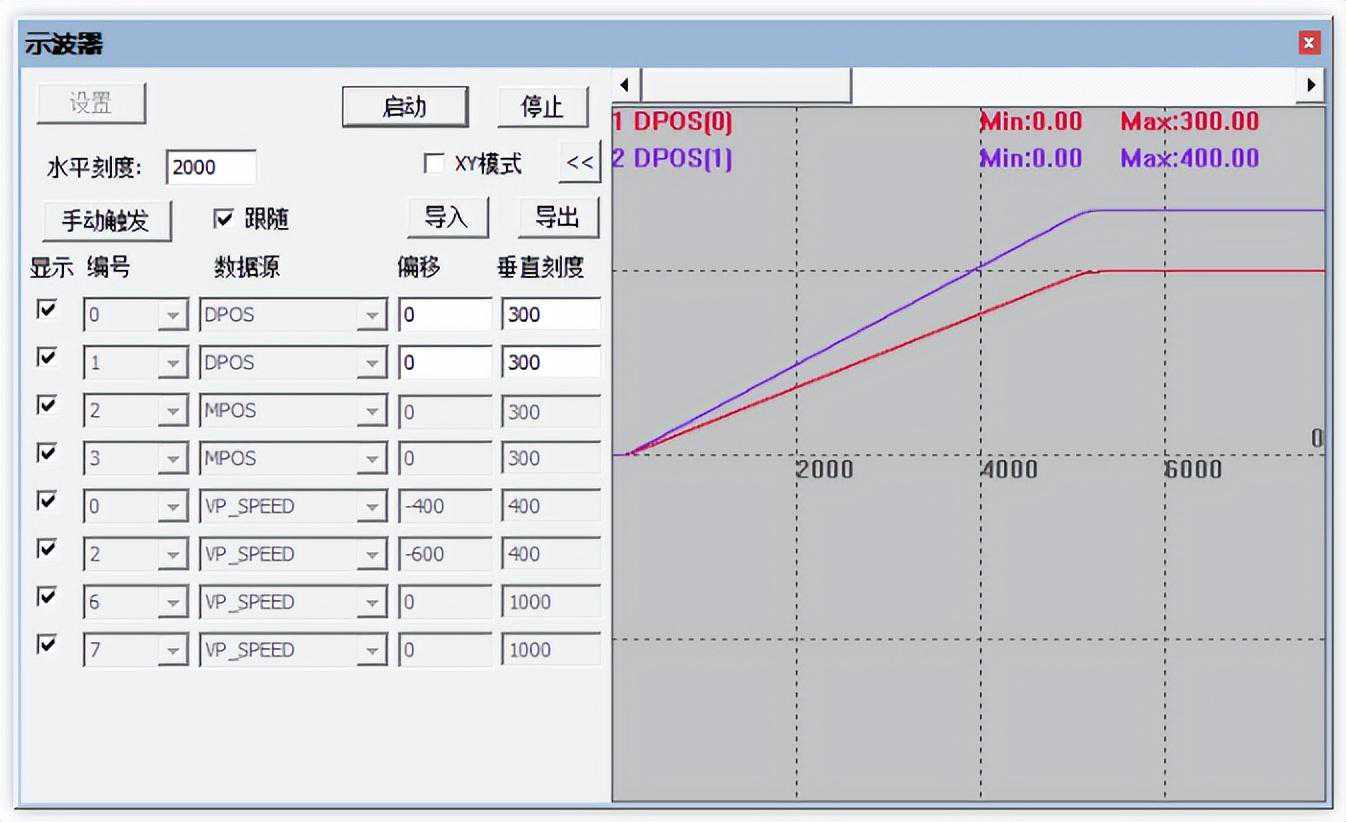 (4)直线插补运动效果图。位置曲线,XY模式下的合成轨迹。