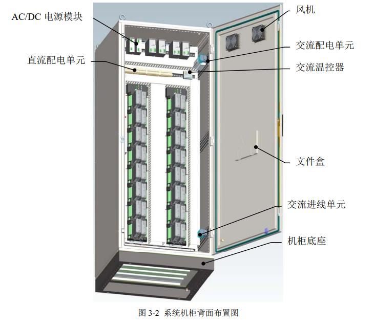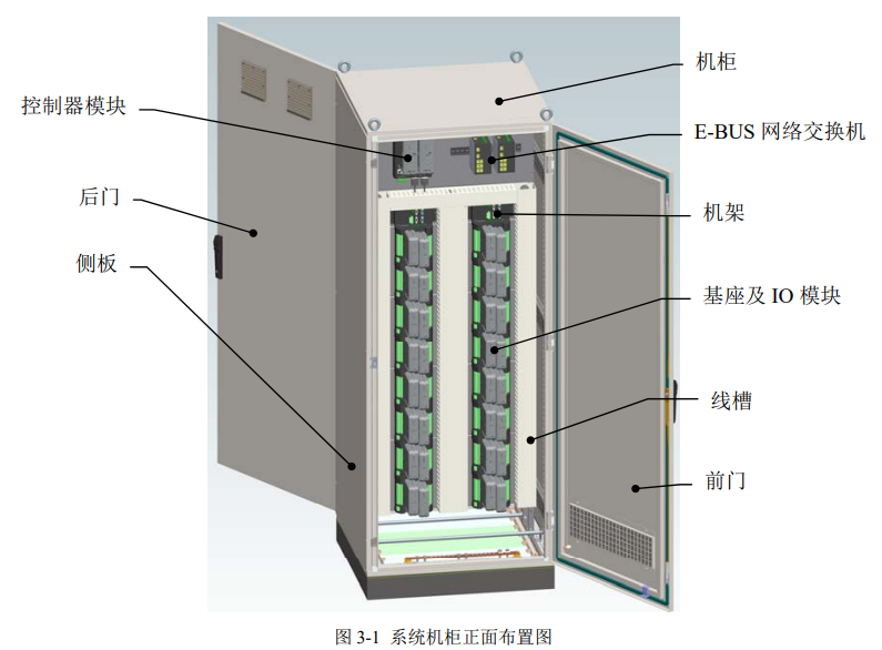 控制站机柜采用正反面对称结构,正面头部安装主控制器模块,背面头部安装电源及配电模块;单面垂直排列IO机架,线槽,IO基座及模块免螺钉安装。空余机架位可安装交换机、远程光纤模块等部件,各部件安装位置可如图3-1及图3-2所示。
