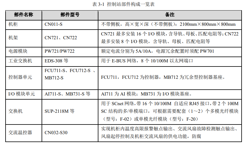 控制站是系统中直接从现场采样I/O数据、进行控制运算的核心单元,完成整个工业过程的实时控制功能。控制站硬件主要由机柜、机架、I/O总线、供电单元、交换机及远程光纤模块、基座和各类模块(包括控制器模块、I/O连接模块和各种信号输入/输出模块等)组成。控制站部件均安装在带锁的机柜内。每个控制站只能配置一对冗余的控制器,但可通过I/O连接模块扩展成最多8个机柜,每个机柜内最多可安装64个I/O模块。