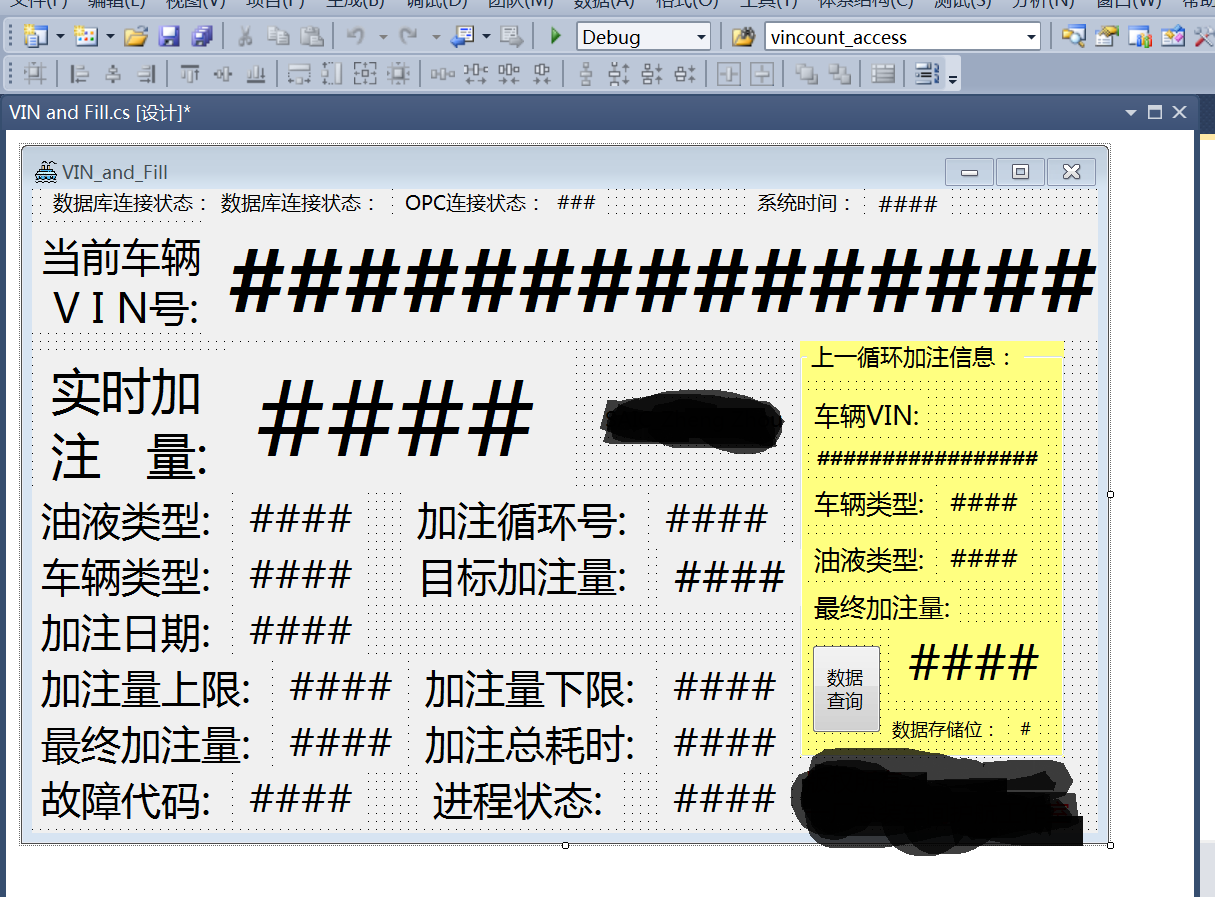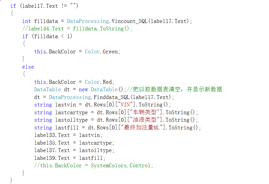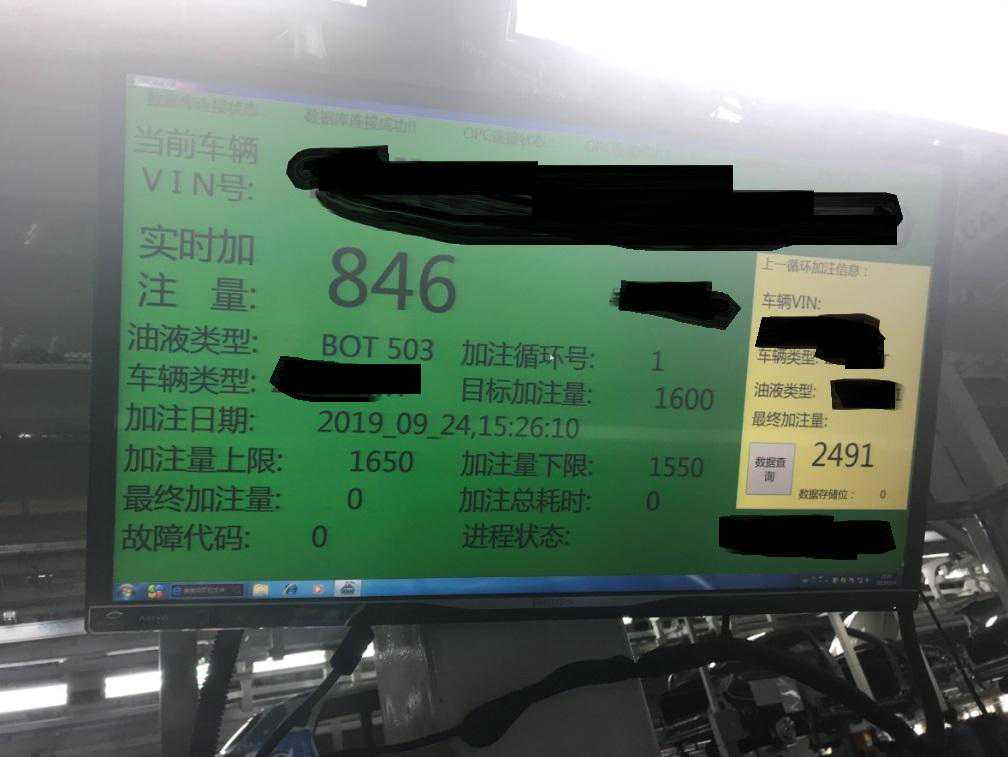 ⑤设备防错的实现,设备在接收到新的VIN号时,软件自动去数据库中查找此车前期是否加注过,如是第一次加注界面绿色显示,反之界面红色显示;