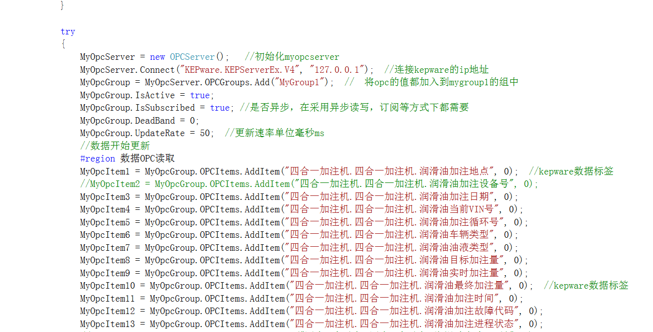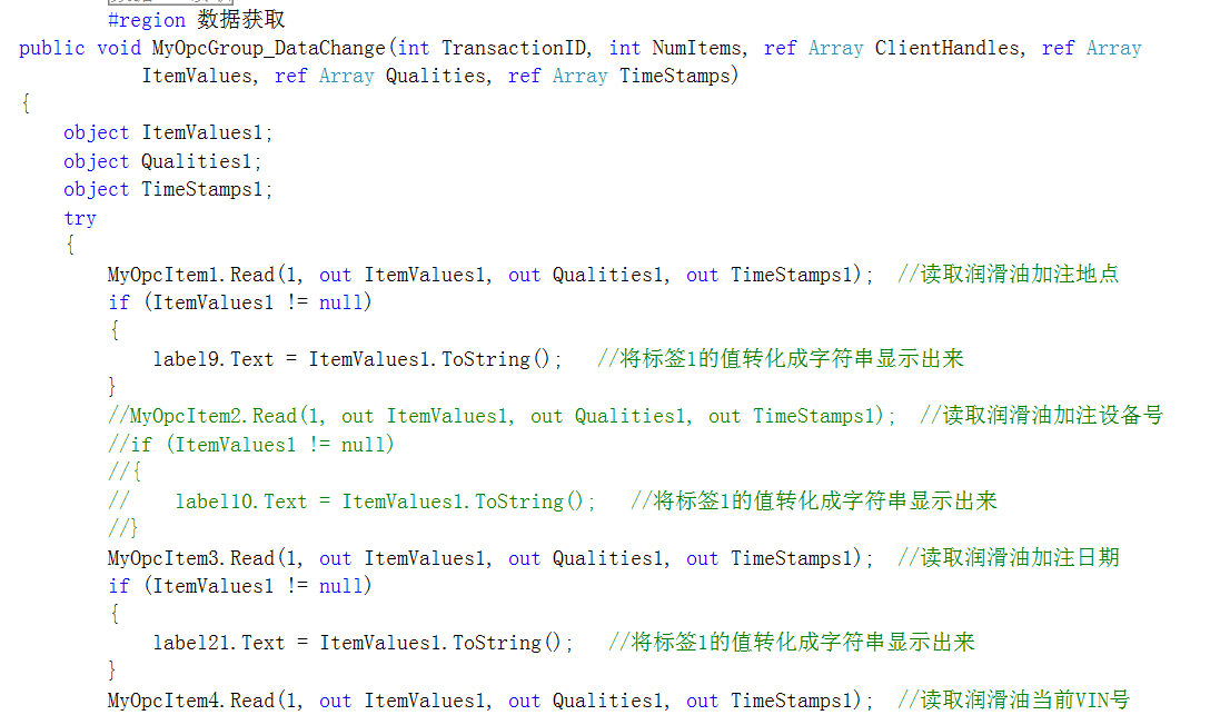OPC数据访问方式采用订阅式数据访问方式,即程序采集到数据存在变更的事件时进行数据的读取,采用这种方式可以减轻服务器的运行压力,也可保证数据的实时采集,见图片4,程序监控"MyOpcGroup_DataChange"事件,一旦发生在kepware中便签数据的变化,程序即可将当前数据传递给界面的便签显示,最终实现界面数据的实时传输显示。