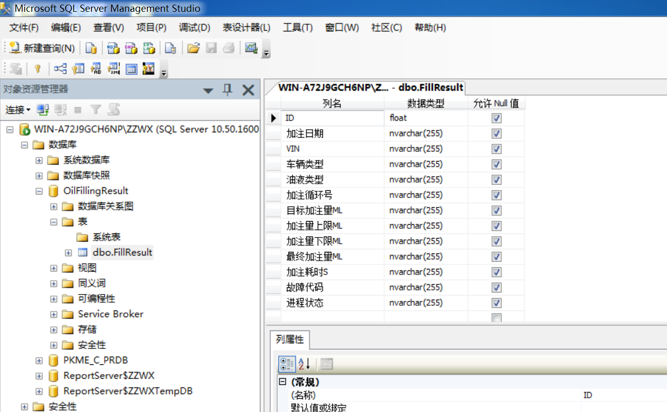 如果要实现读取到的数据存储的功能,在电脑端需要安装数据库软件,从使用便利性和稳定性选用微软的SQLServer2008进行数据存储,在数据库中建立OilFillingResult数据库,并建立存储数据的表FillResult,最后建立存储数据的表格如图5与图6。