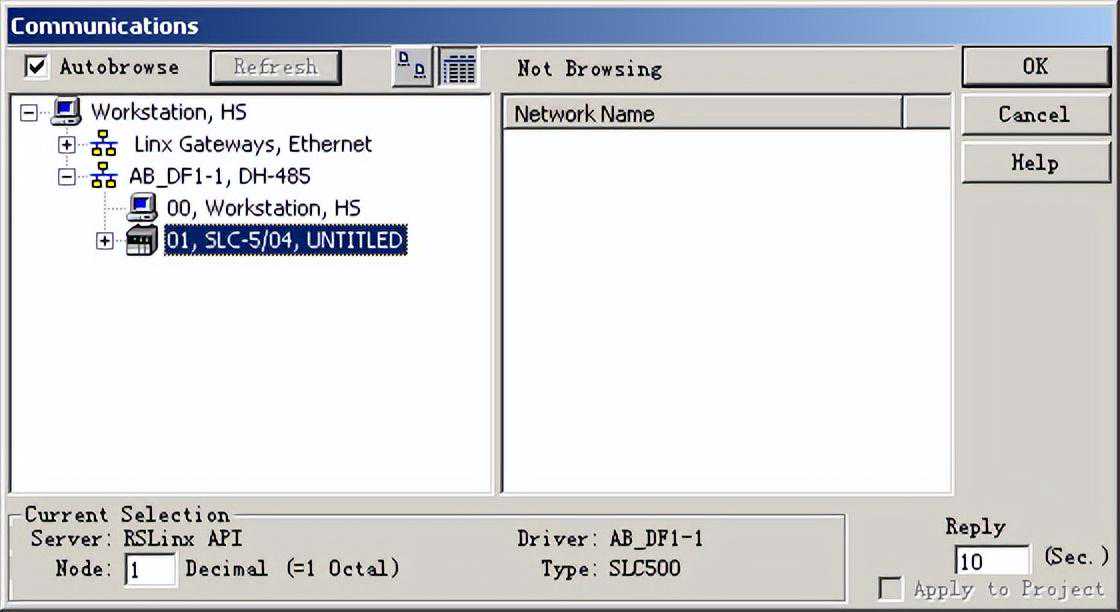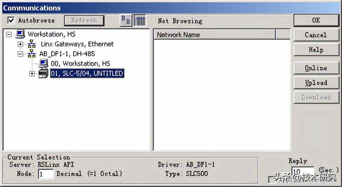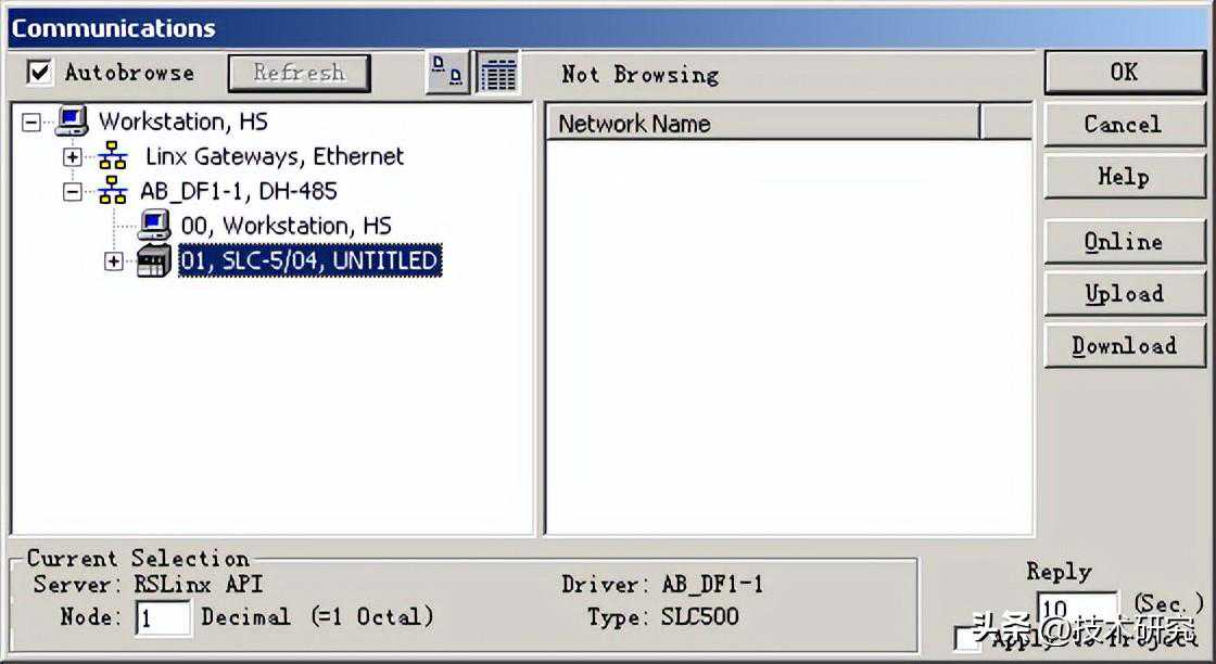 从这个画面可以看出,其实质是RSLogix500软件调用RSLinx,搜索需要下载的PLC。当选中SLC500后,右侧的“Online”,“Upload”和“Download”从灰色变成黑色,表示可以进行上传和下载的操作。