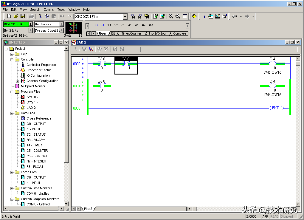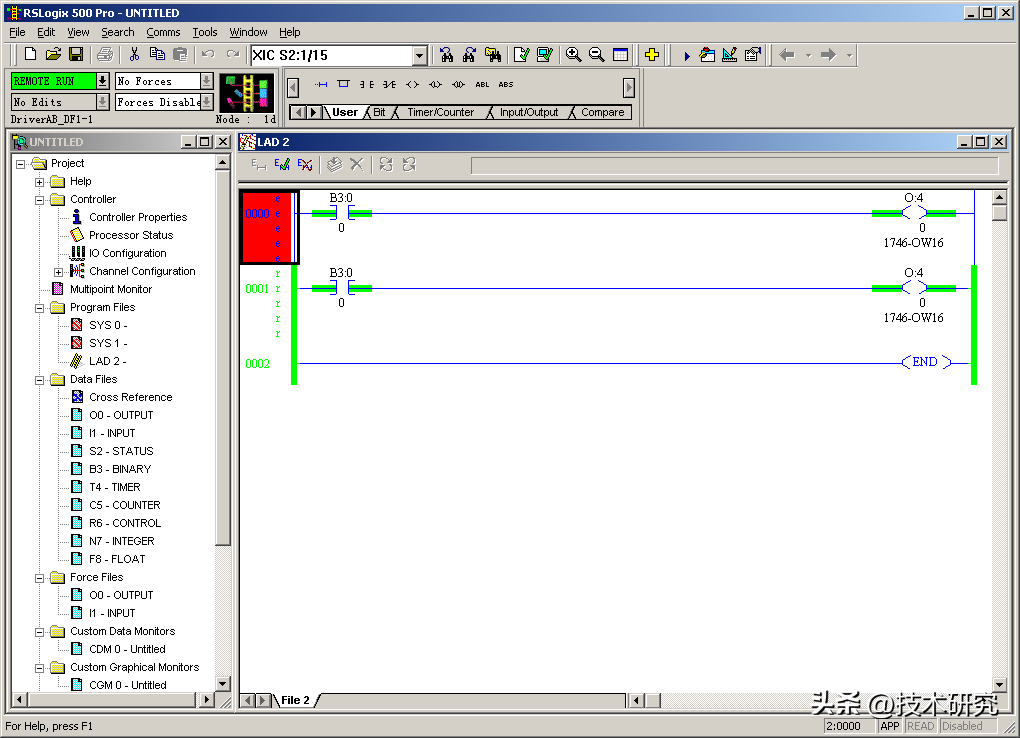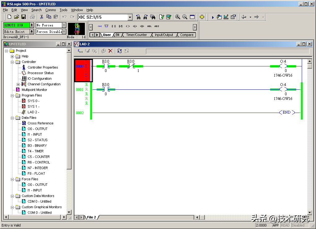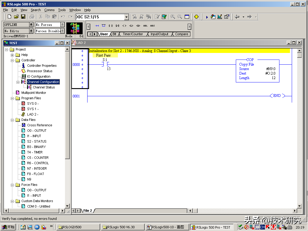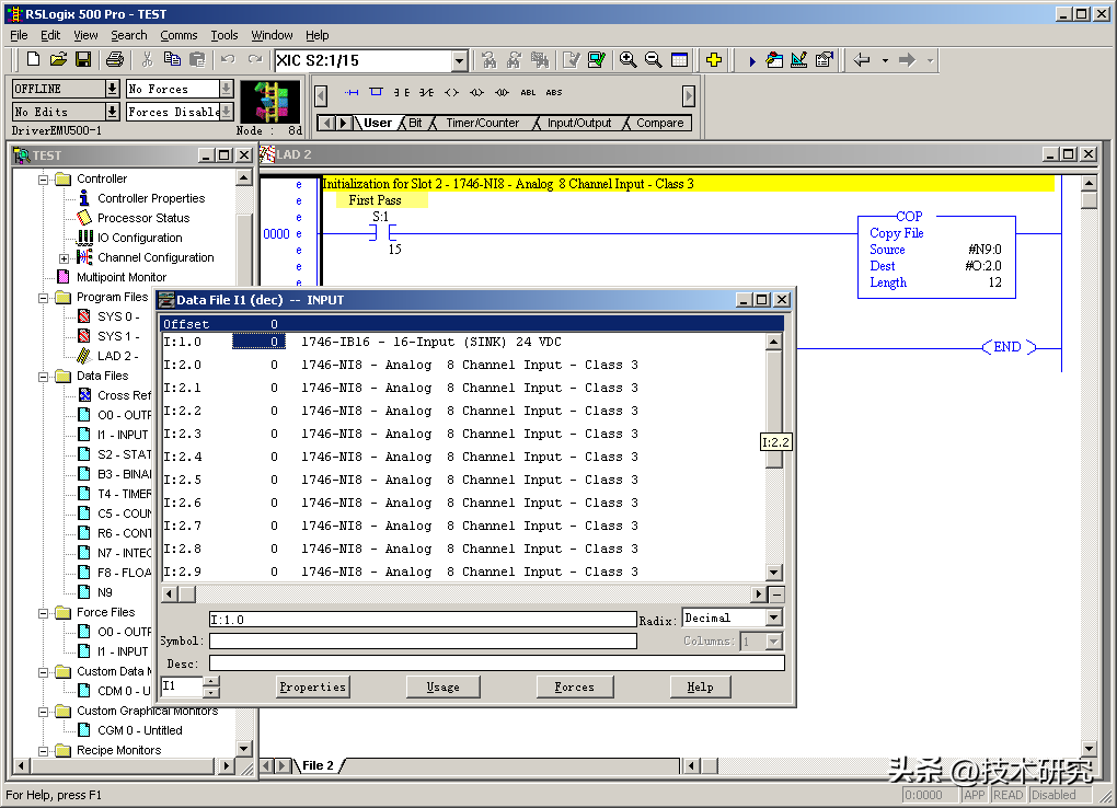 如图15所示,I:1.0是分配给16点数字量输入模块1746-IB16的,该模块插在1号槽;而I:2.0~是给8路模拟量输入模块1746-NI8块的,该模块插在2号槽。