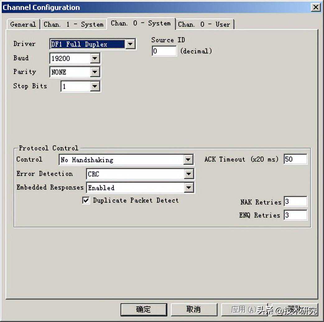 对于SLC500型PLC,每块CPU上一般有2种通讯接口:通道0(Channel0),是9针DB9串口,默认通讯协议就是DF1通讯;对于1747-L551型PLC而言,通道1(Channel1)是以太网接口。在通道配置里可以根据需要修改通讯参数。