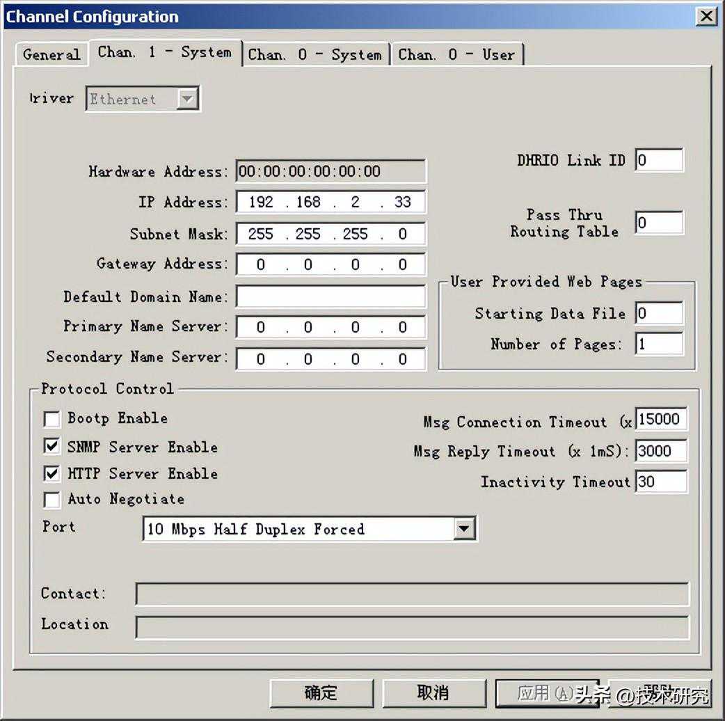 如图12所示,对于SLC551型PLC,它的通道1(Channel1)是以太网接口。我们在这里所需的进行的配置如下: