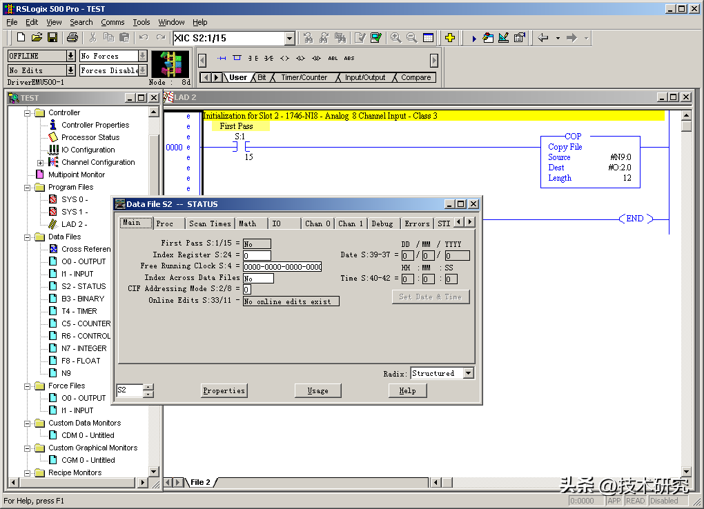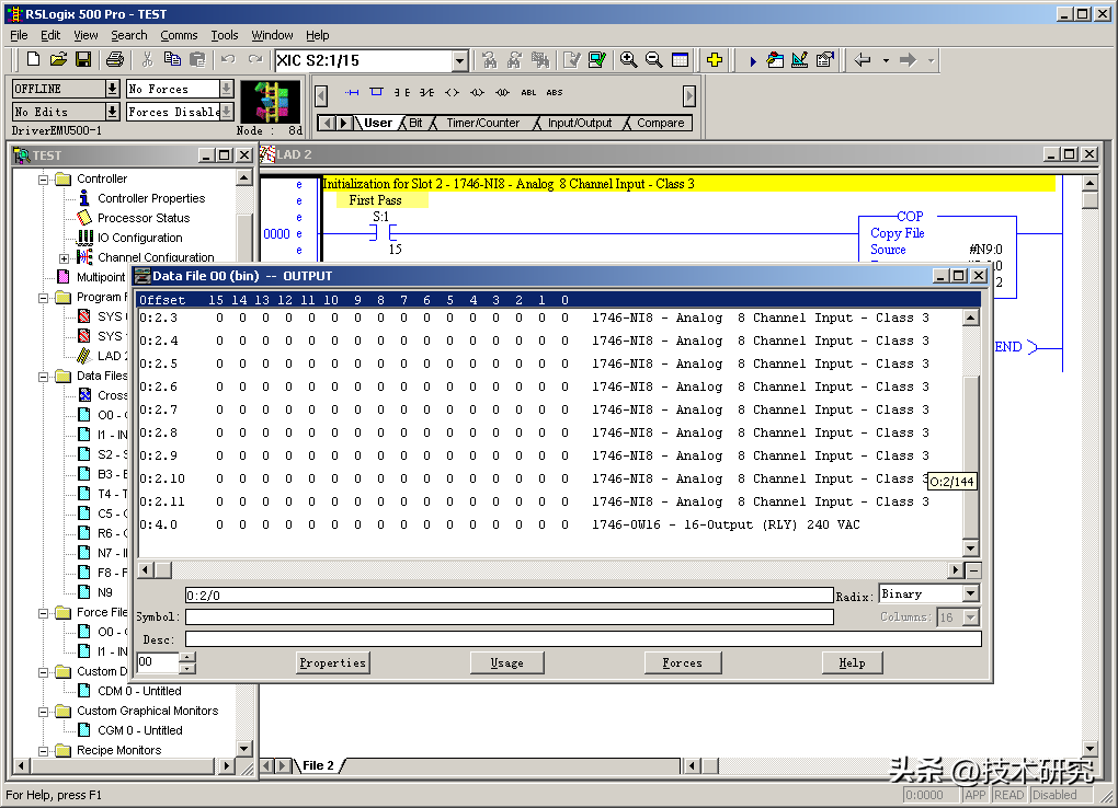 这里有一点要注意:图14中和图15中显示的1746-NI8是同一块模块。之所以一个O2:0有16个0,而I:2.0只有一个0,是由于变量的现实方式不同。注意两图的右下角的“Radix”选项。这是变量的数字显示方式。显示方式有:2进制,8进制,10进制,16进制和ASCII码显示。图14中采用的是2进制显示方式,而图15种采用的是10进制显示方式。不同的变量采用不同的现实方式显示,可以更明确的看出各变量的意义。