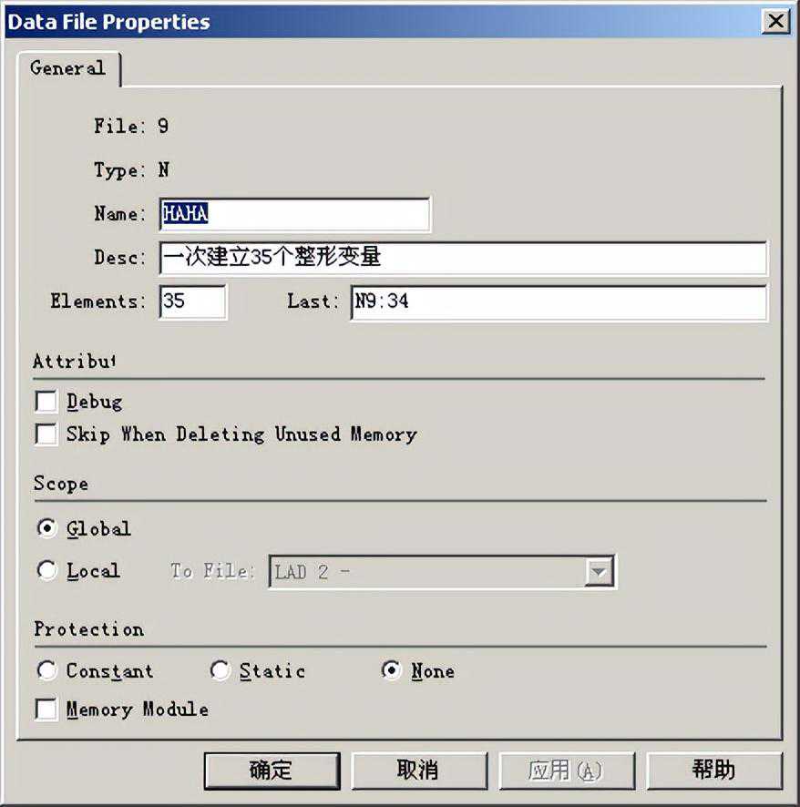图19中,由于系统默认的变量到F8,所以新建变量就从9开始计数。Type表示用户需要建立的变量的类型,可根据需要进行选择。Name是变量的变量名(只能用英文)。Desc里是对变量的解释和说明(可用中文)。而Elements表示的是建立的这一批变量的数量(最大不能超过256)。