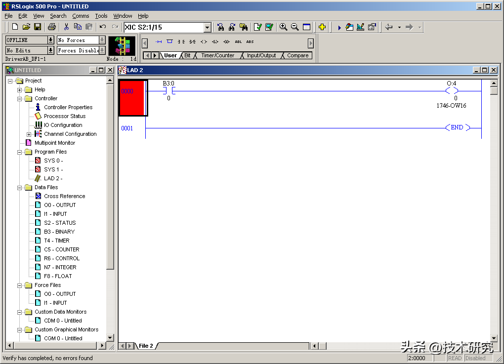 参见图28,注意左下角,软件显示“Verifyhascompleted,noerrorsfound”。说明程序编译通过。可以下载给PLC了。也可以保存程序文件。程序文件的后缀名是*.RSS。