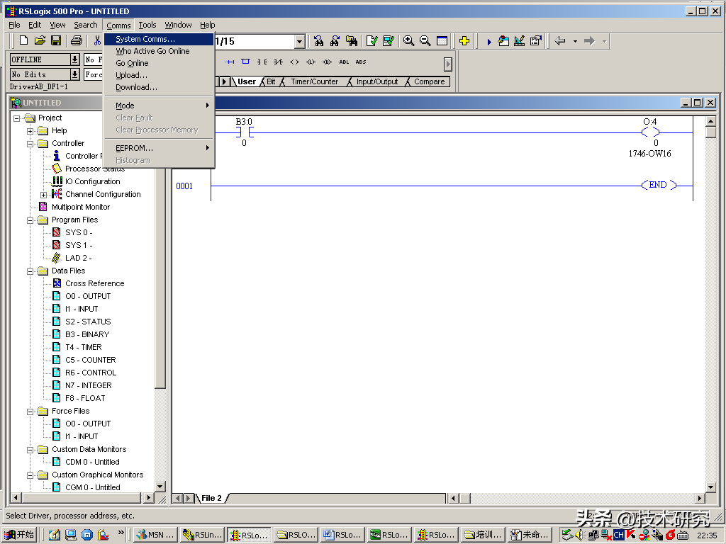 根据要求,将电脑通过编程电缆与SLC500连接好,打开RSLinx,建立串口通讯驱动,找到SLC500。打开已经建立好的程序。如下图所示,选中Comms下的SystemComms: