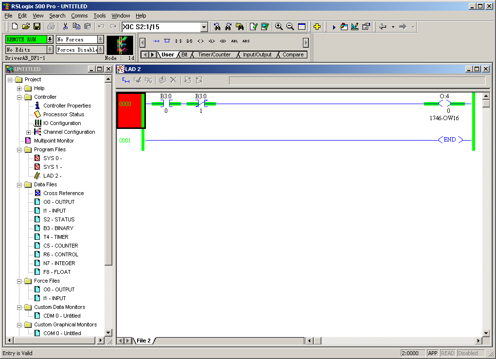 此时,程序已经开始运行。当把B:3.0/0至1后,O:4.0/0=1,1746-OW16的第1路灯点亮。如下图所示: