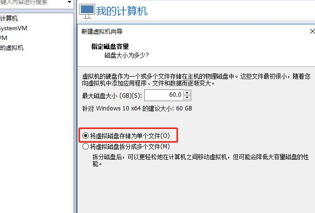 6,选择将虚拟机磁盘存储为单个文件,单击“下一步”。