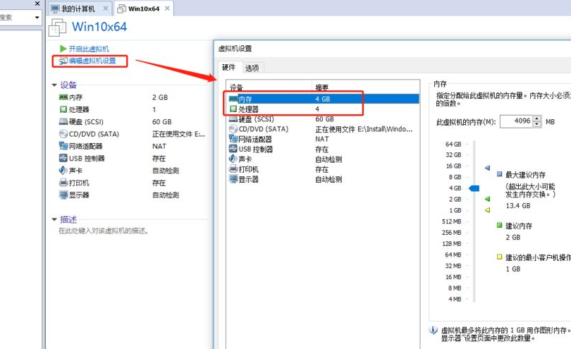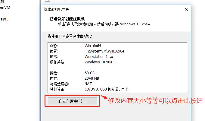 7.单击“自定义硬件”以修改内存大小,处理器的数量,设置在弹出窗口中。如果此时未设置,则还可以修改随访。修改完成后,单击“完成”。