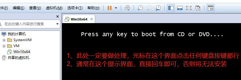 10.当在虚拟机中启动Win10时,界面出现[按任意键从CD或DVD启动],因此必须将光标放在虚拟机中,然后按任意一个按钮,通常按下输入可以。如果未及时按下这,将出现与第二个数字相同的接口。此时,它只能重新启动安装并重新选择。