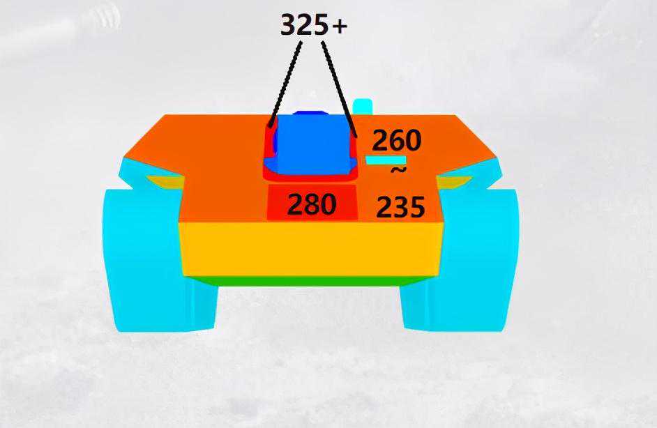 在6°俯角的情况如上图所示,等效增加到235-260mm,车体中间则高达280mm。同级银币弹几乎不可能打穿,甚至大部分中坦重坦的金币弹在中远距离也很难打穿。
