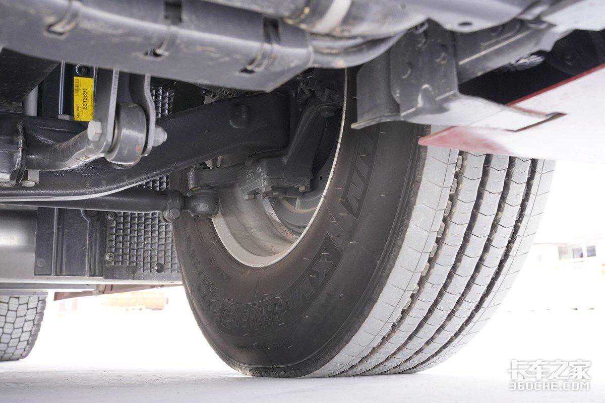 在底盘方面,两车前桥均采用了两片簧设计,并且都可以选装前桥的空气悬架,带有高低调节功能,不过这一项配置暂时不太适合我们国内的国情和路况。而后桥均为6X2R带提升桥的设计,在轻载以及空载的情况下均可以提升最后一轴实现更低的摩擦系数,达到更高的燃油经济性。