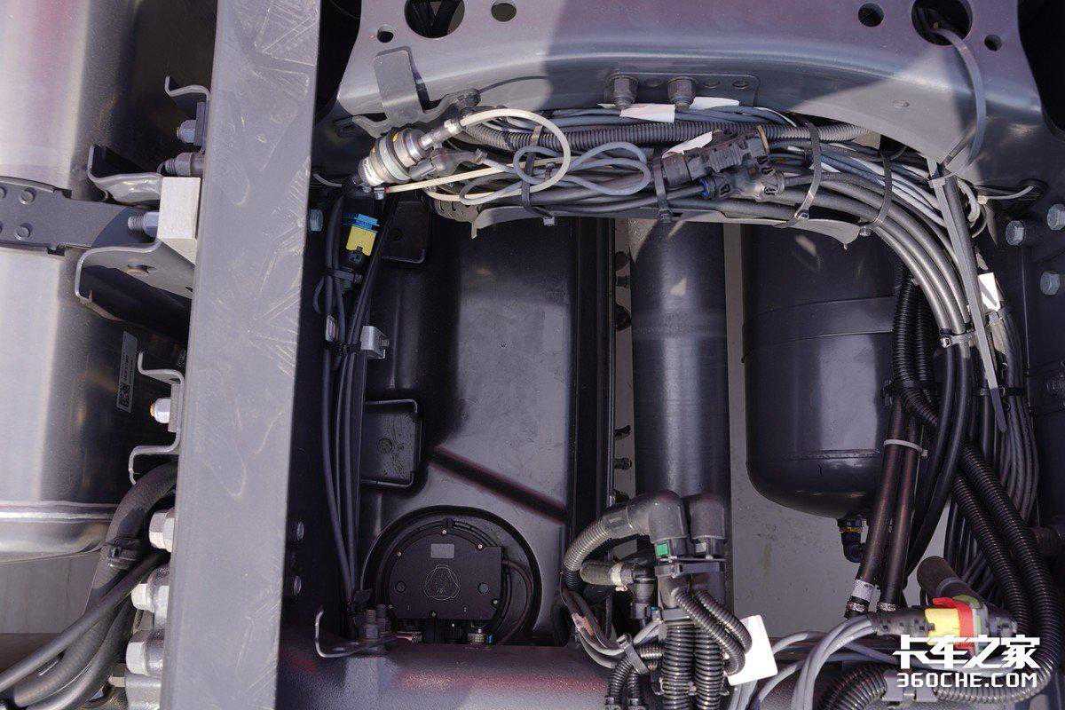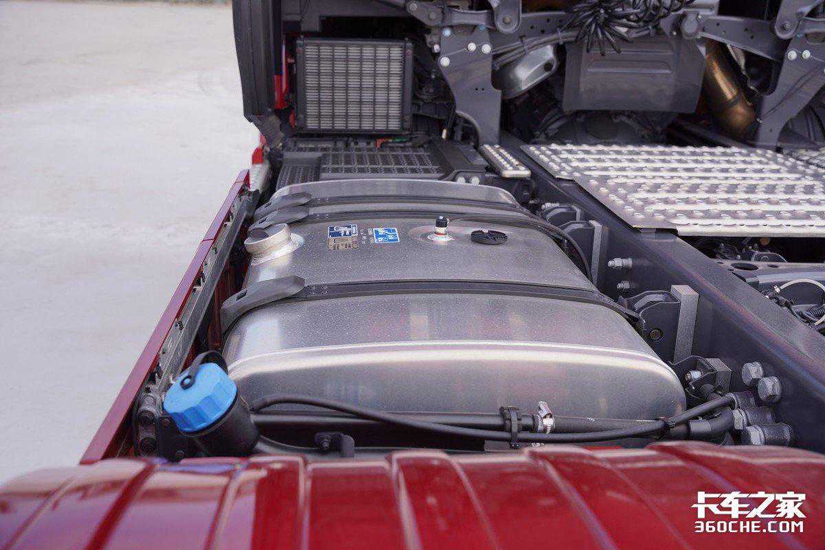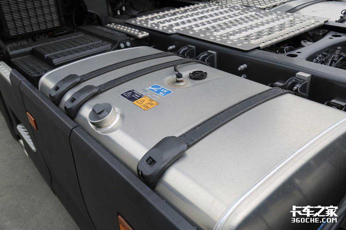 斯堪尼亚S系列在底盘上的功夫也不少,普通S系的油箱容积为900升,V8车型的油箱容积为800升,并且都将尿素系统、储气罐等零部件整合在车辆底盘下方和轮拱罩之间,尿素罐容量为73升,灵活运用了车架内部的空间。