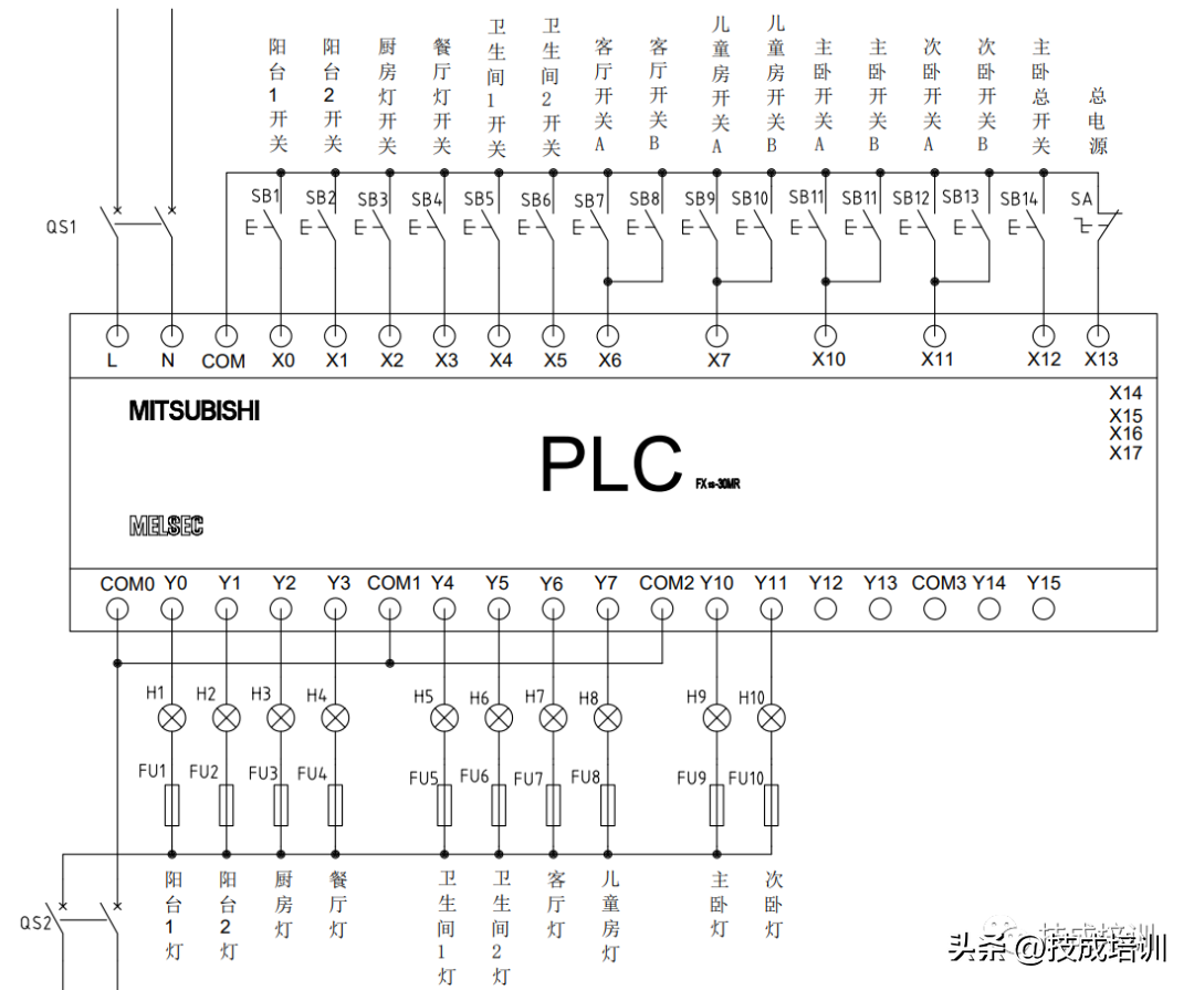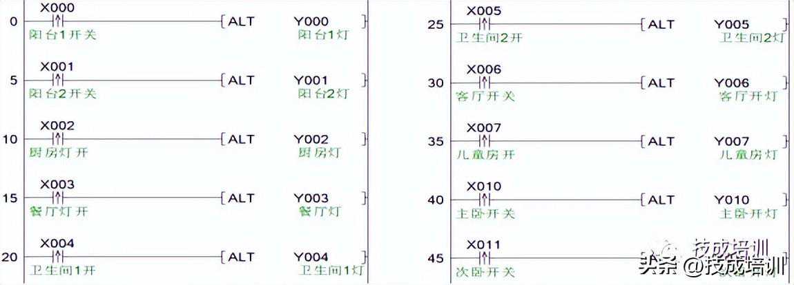 每个按钮一一对应其控制的照明灯进行控制,使用ALT交替输出指令,该指令每触发一次,输出点的状态就转换一次,所以每按下一次按钮,照明灯的状态就变一次。