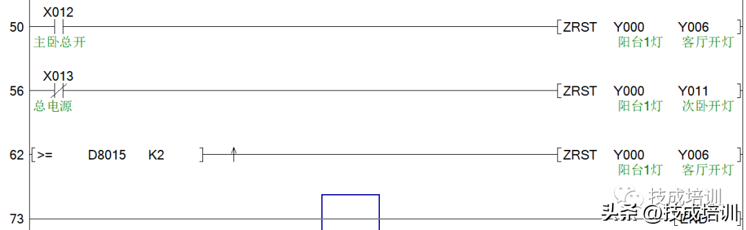 第56步,总电源开关一旦导通,Y0到Y11全部复位,就是整个房间的灯都关闭,由于程序外部接的是常闭信号,所以在程序内部需要写成常闭。