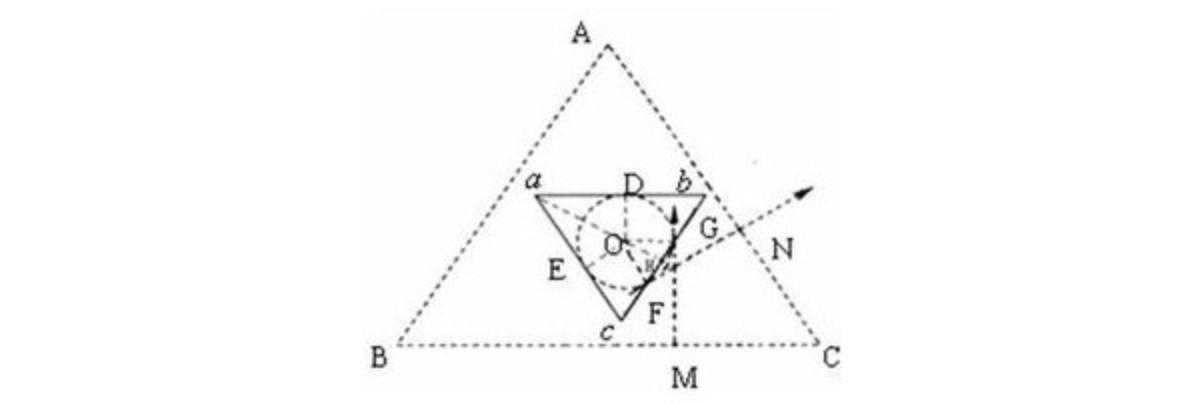 反思:如果不是先画圆,这道题中粒子运动轨迹和磁场边界临界点的确定比较困难。另外,切记不能想当然,在计算最小边长时一定要注意圆周运动的轨迹并不是三角形磁场的内切圆。
