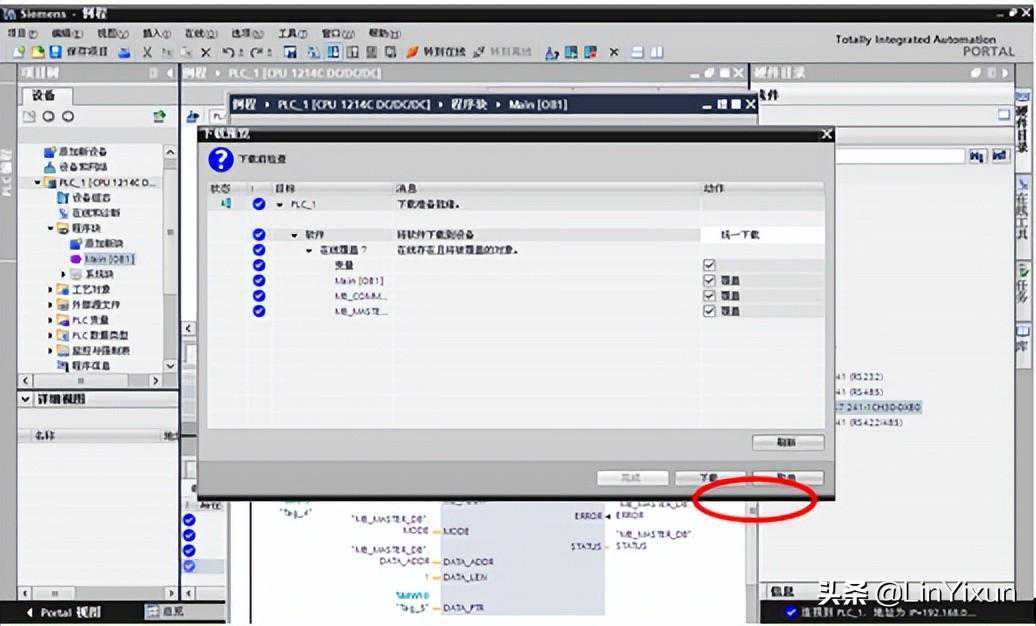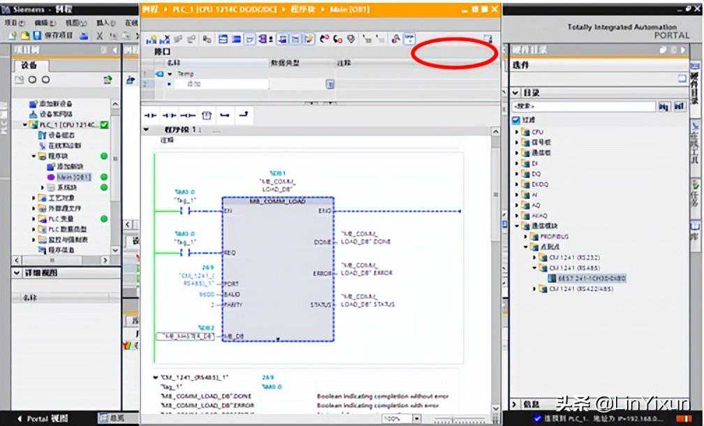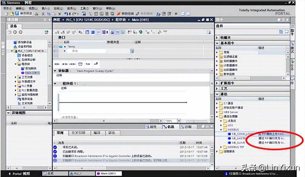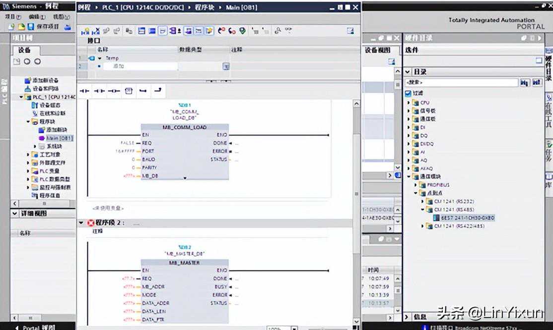 在左边的设备中找到S7-1200/程序块,打开主程序(Main[OB1])。在右边的指令栏里选择通信/通信处理器/MODBUS,添加MB_COMM_LOAD和MB_MASTER。